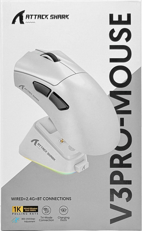 • Broadcom BK52820 MCU• PAW3311 Sensor• Up to 25,000 DPI• Featherlight 62±3g Build• Omron Switches – 100 Million Clicks• Tri-Mode Connection – Wired / Bluetooth / 2.4GHz• Up to 1000Hz Polling Rate.• 500mAh High-Capacity Battery• 40G Acceleration & 400 IPS Tracking