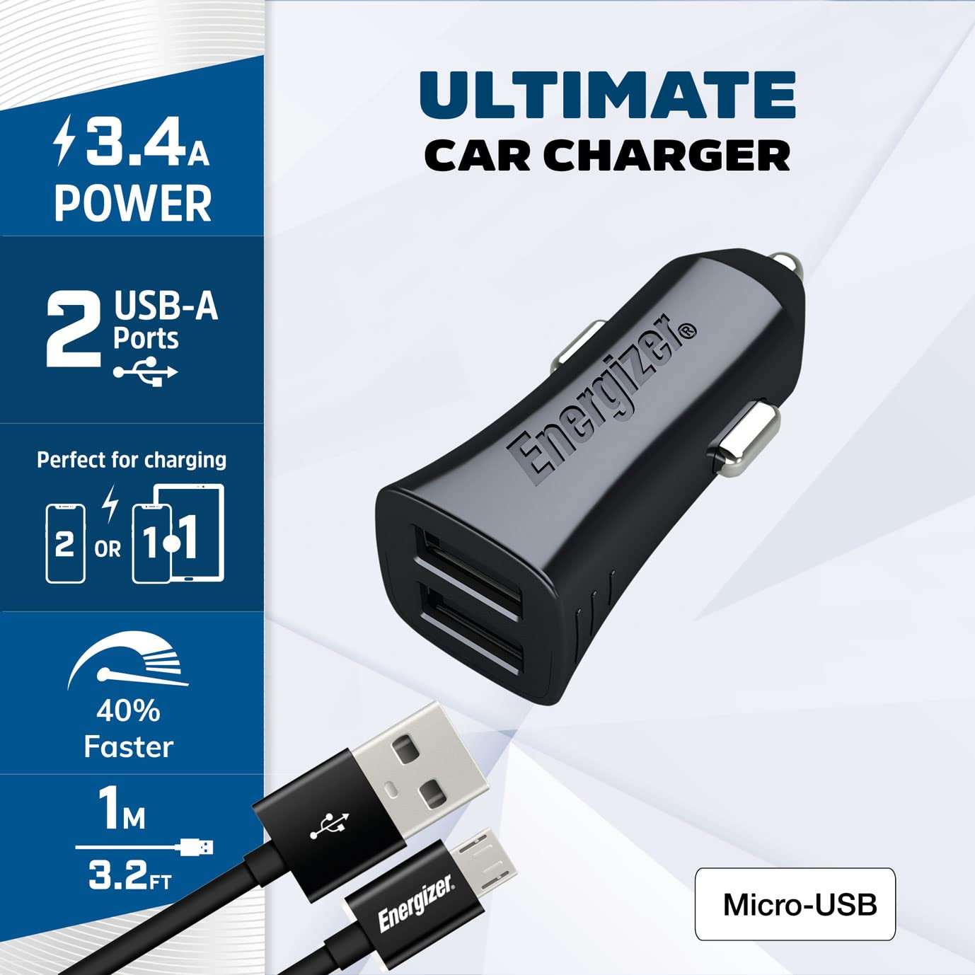 Energizer 3.4A 2 Ports Car Charger with micro-USB Cable - Black